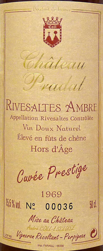 Robe acajou, brillante, légèrement voilée. Nez nettement typé rancio, puis viennent des notes empyreumatiques et le vieux bois, les pruneaux à l'eau-de-vie. La bouche est à l'image du nez : très marquée rancio avec en même temps des notes de sous bois, de vieux marc, de brou de noix avec une bonne persistance aromatique.